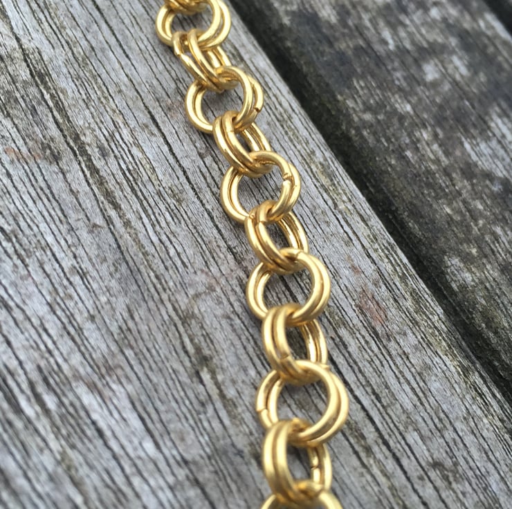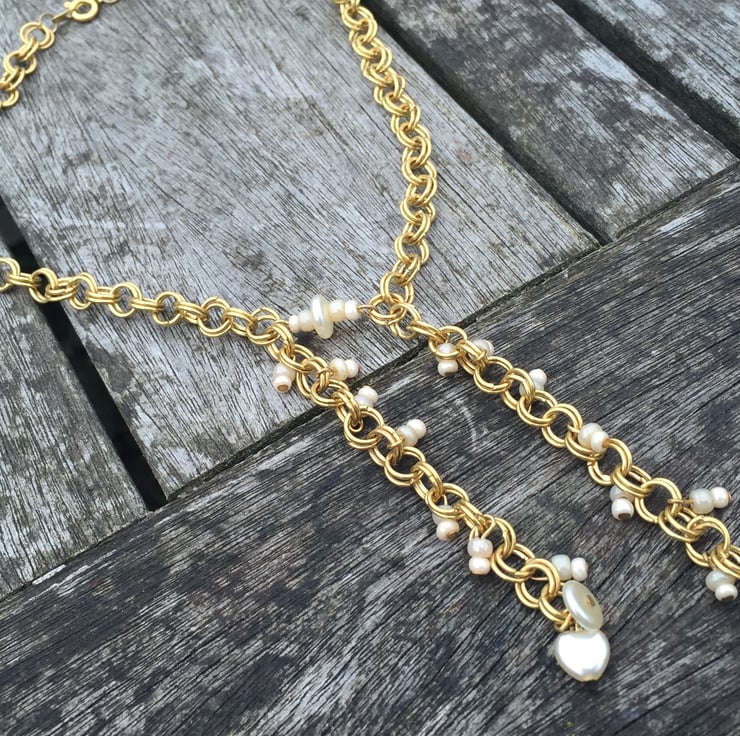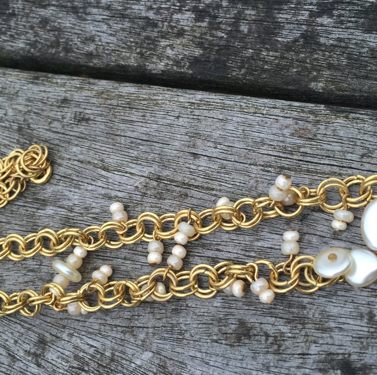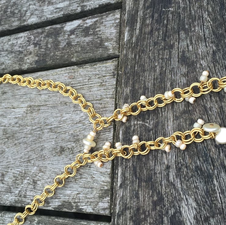 Gold plated chainmaille necklace with swarovski cut glass pearl cream beads.