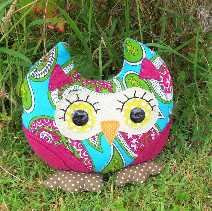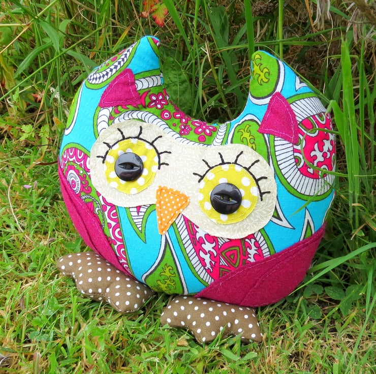 The background fabric is a vibrant 1970s cotton, and her layered wings are made from a tactile wool mix fabric.