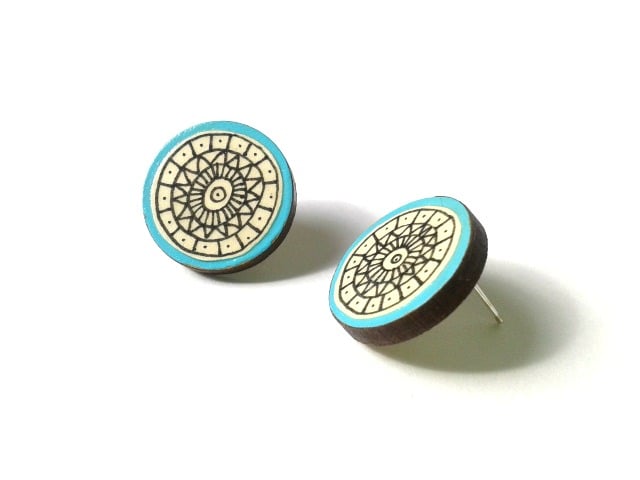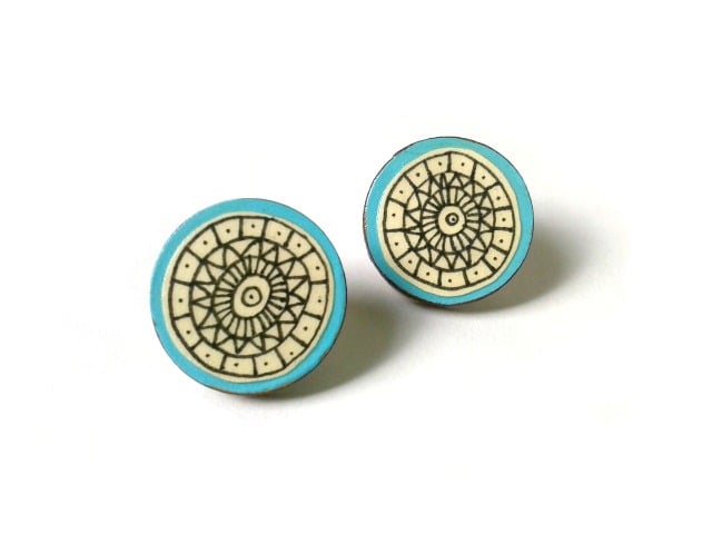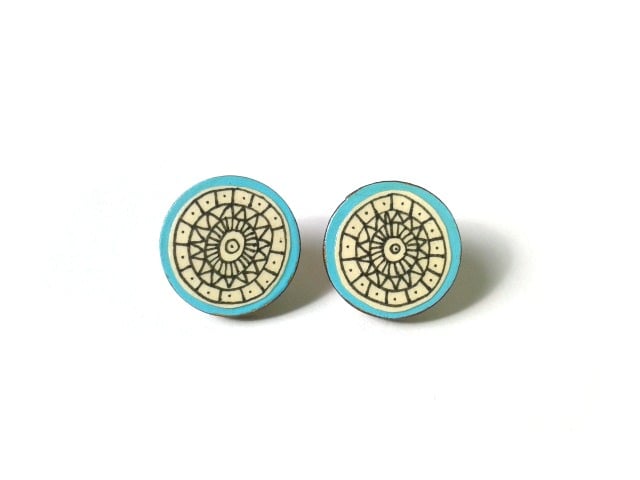 Featuring a hand illustrated geometric circle pattern drawn on recycled paper and mounted on wooden circles. The discs are painted turquoise. Sealed with layers of varnish and a protective enamel finish.