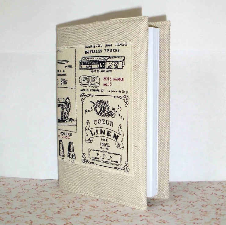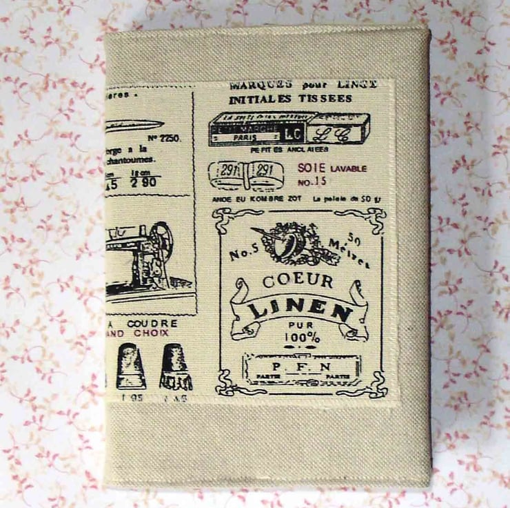 This is an A6 notebook, with good quality lined paper,it has been covered in a linen effect fabric, with a panel of old fashioned French needlework pictures. It is interfaced and lined in cream fabric, the cover can be removed, and a replacement notebook fitted when needed.