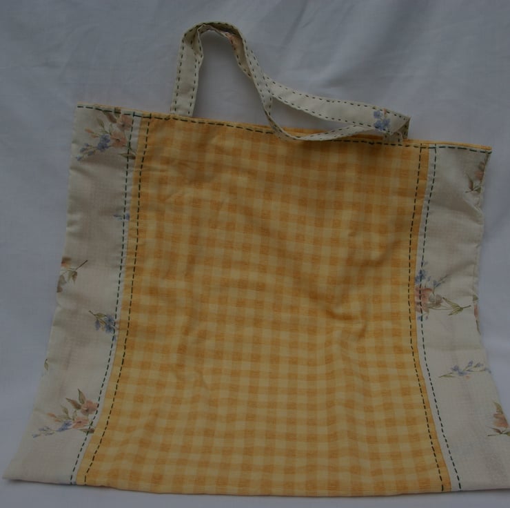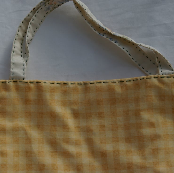 Hand sewn Short handled large Toto Bag created in orange, cream, dark green and blue. The bag has been sewn in three panels. The centre panel is a two tone orange check cotton material while the border material is a cotton and polyster mix in cream with tiny blue flower sprays. The seams have been reinforced and decorated with a line of stitching in a dark green embroidery thread. The same decorative green stitching has been hand sewn around the top of outside of the bag.
