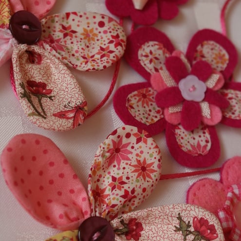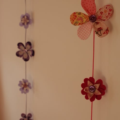 The garland features seven individually handmade felt and fabric flowers, with ribbon details and button centres. The garland can be hung either horizontally or vertically.