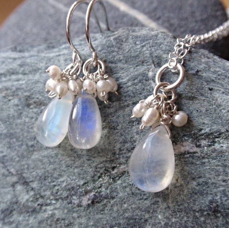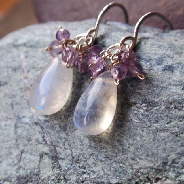 These pretty rainbow moonstones catch the light beautifully with flashes of blue. They are teardrop briolettes, smooth and high quality, with some inclusions. The tiny faceted pink amethysts are a pretty lilac pink-purple, very soft, and complement the moonstones. I have handmade these earrings using sterling silver wire.