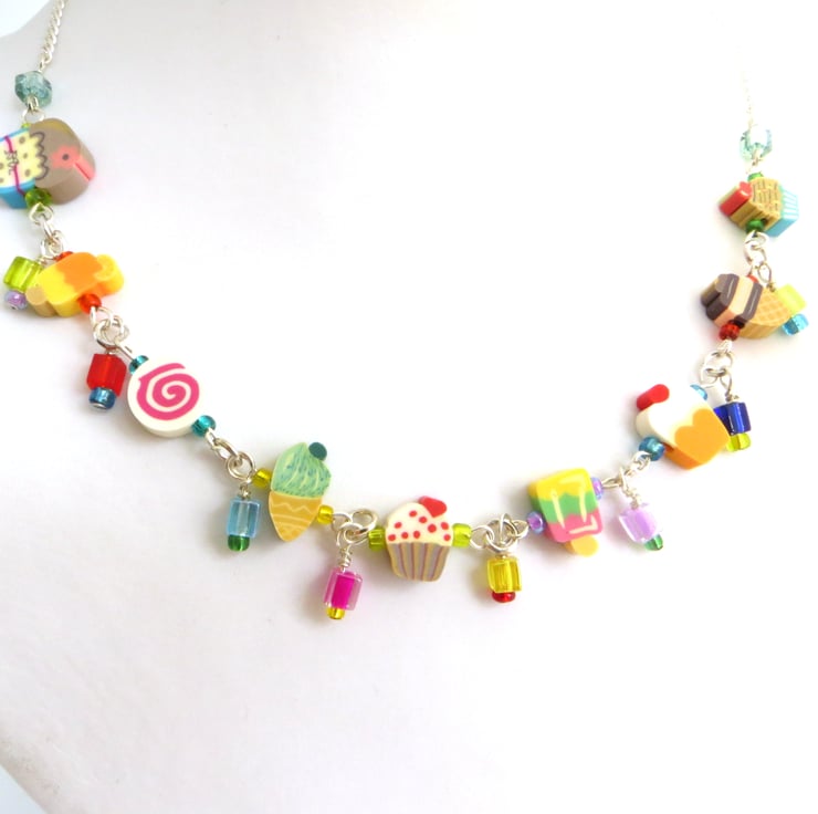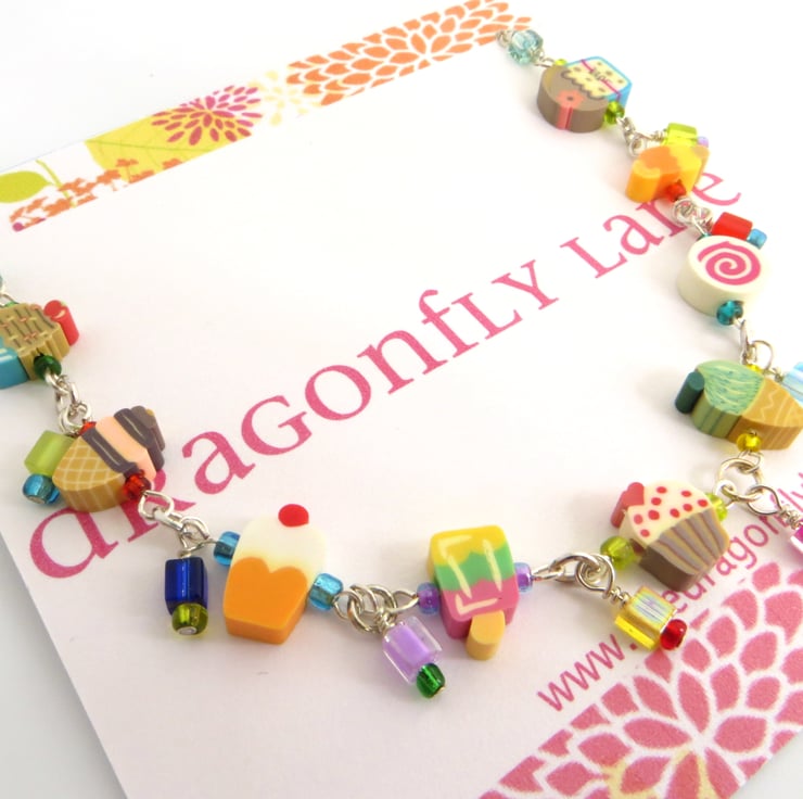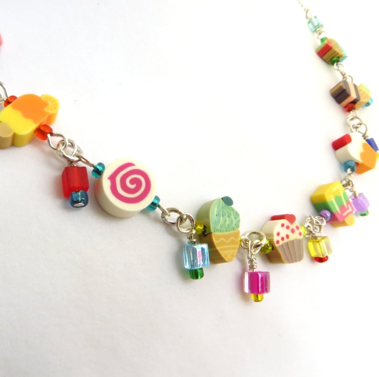 A super sweet necklace featuring miniature slices of fimo cake and ice cream in a delicious array of colours linked together with contrasting bright seed beads and teeny glass cubes to give lovely extra detail and movement.