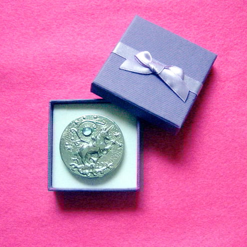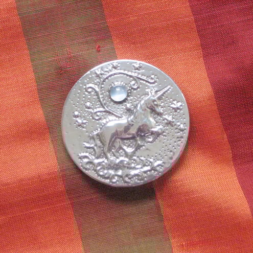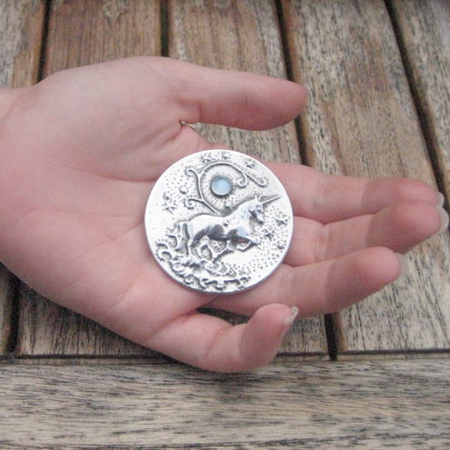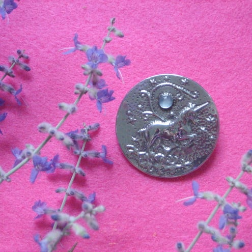 This large dramatic brooch has been hand-made in glittering modern pewter, and is set with a genuine moonstone moon. In spite of its size,45mm diameter, it is light in weight, and has a 25mm pin with safety catch on the reverse.Comes in a pretty purple gift box.