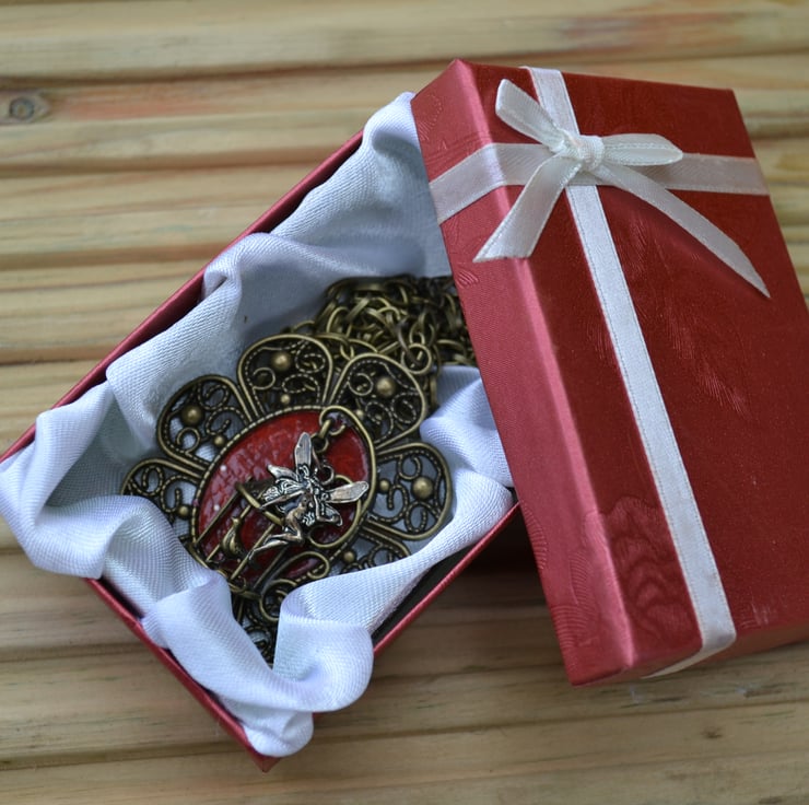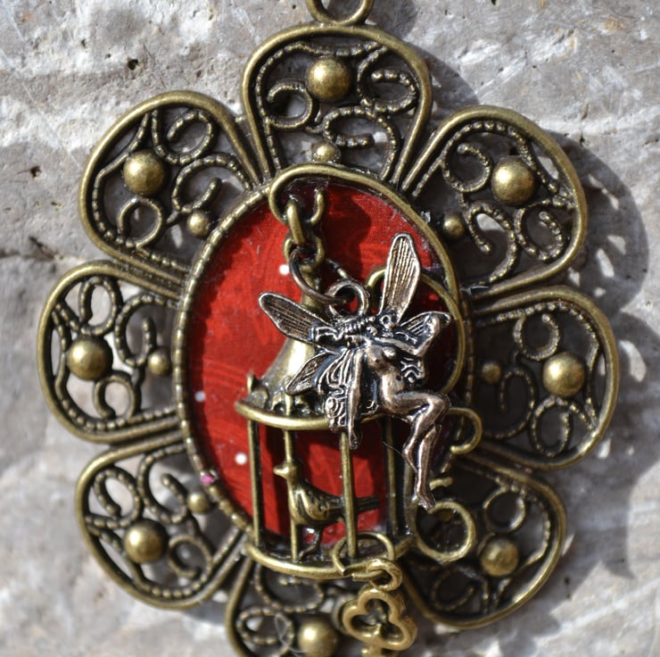 I have created a unique pendant necklace that tells a story. The pendant has a lovely red decoupaged back with a bronze bird cage with the attached key and a kind fairy who is there to let the bird out. The pendant is oval shaped and is 5cm wide, 6cm high and is on a chunky bronze chain which is 60cm in length end to end and finished off with a bronze lobster clasp and ring with chain detail.