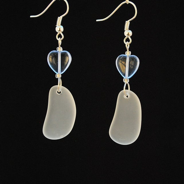 These earrings have been made from two beautifully matched pieces of beach glass and shiny pale blue heart beads. We have tumbled the beach glass so it is rounded and smooth. The earrings have been mounted on silver plated ear wires.