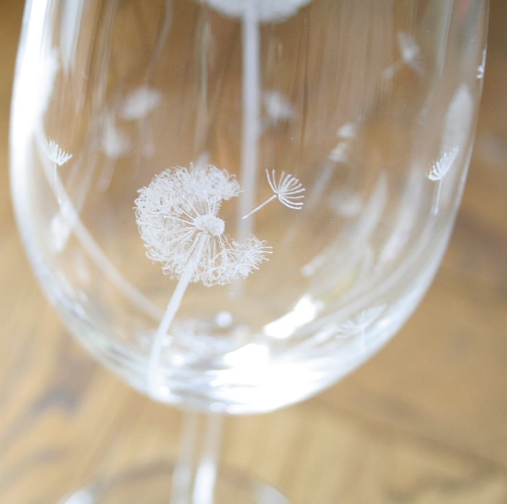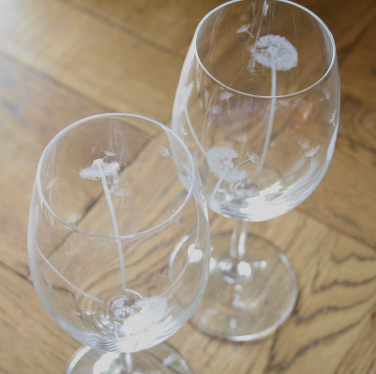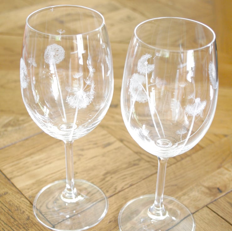 Pair of Bohemia crystal glasses. Beautiful hand crafted blown crystal, that is lead - free. I have engraved dandelions onto each glass using a high speed rotary tool. Original one of a kind hand etched design. Brilliant sparkle and perfectly clear.