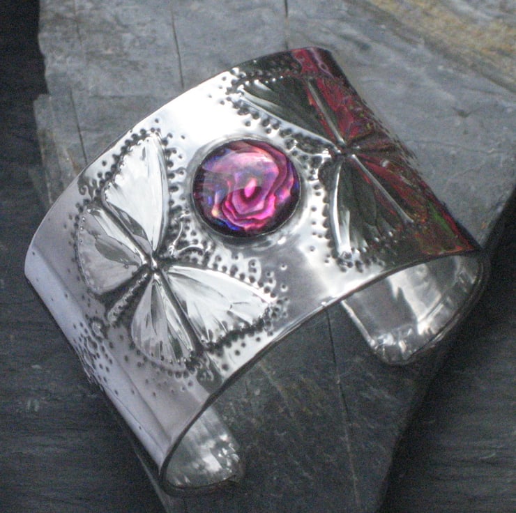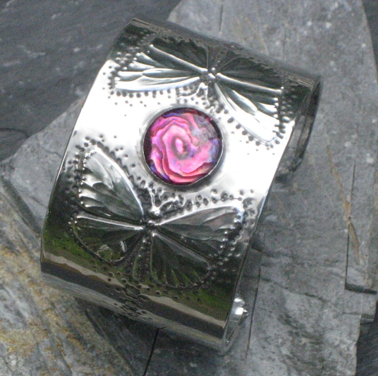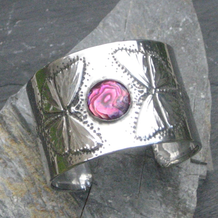 This stunning art nouveau style bracelet has been hand-made in shiny modern pewter, and features a lovely paua shell cabochon. The cuff is 38mm (1.5) deep,155mm (6.15) long. There is a space for putting the cuff on and off by sliding the hand in sideways. A perfect gift for a woman for a 10th Wedding Anniversary, Christmas or Birthday.