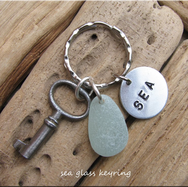 A small seafoam charm with a real vintage key. Complimented by a stamped aluminium charm with the word SEA,