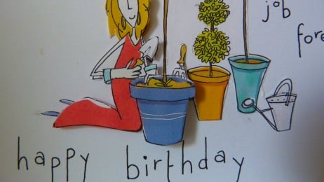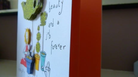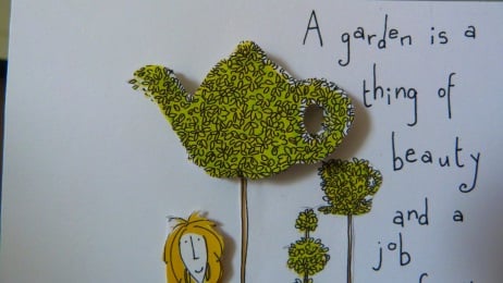 A fun design of a lady tidying up her teapot topiary plant, decoupaged onto quality white card. The caption 'a garden is a thing of beauty and a job forever' handwritten in black ink with happy birthday.
