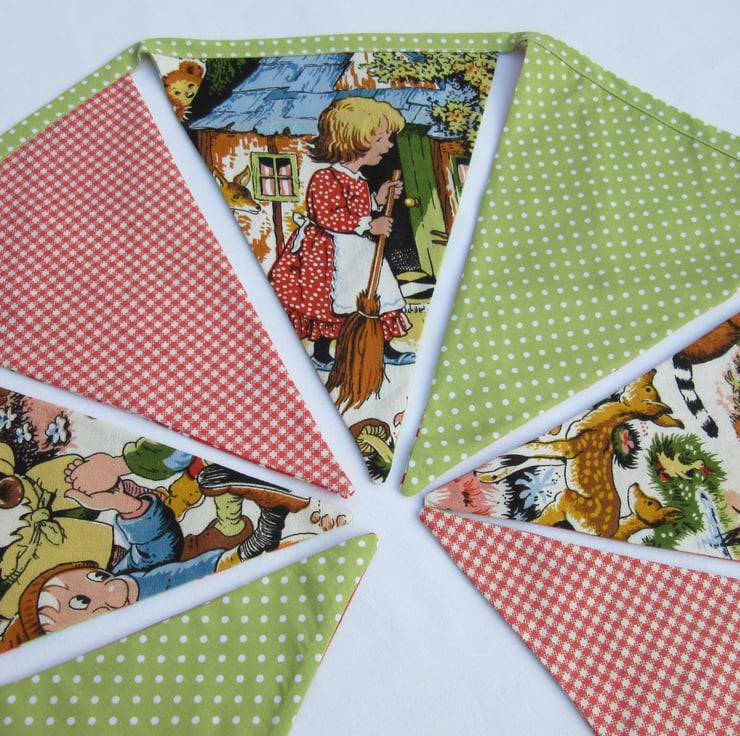 Unique bunting using vintage fabric scenes from traditional fairy tales - one flag shows dancing dwarves, in another a little girl cleans a woodland cottage, and a third has some bears, deer and other woodland animals. Just think of the stories you can share with your child - how about Snow White? Or Goldilocks? Or how about a story you make up together.