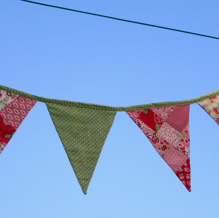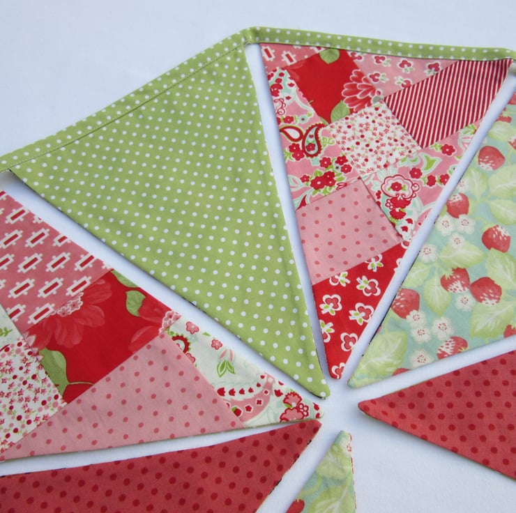 And if you fancy a change, just reverse the bunting for a fresh spring feel with strawberries, spots, florals, and checks combined with a hotch-potch of patchwork in red, pink and green. (prints will vary)