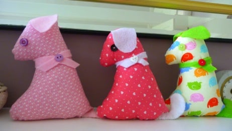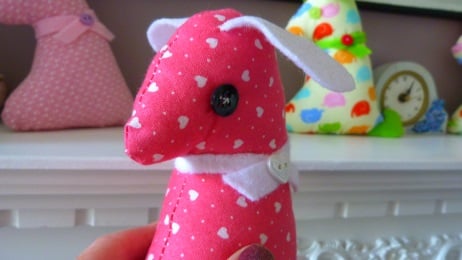A cute design of a puppy dog cut from Makower 100% cotton fabric, machine stitched for strength and filled with 100% polyester. The ears, collar and tail made from white felt and hand sewn. Little black button eyes and a pretty white heart shaped button finishes off the collar.