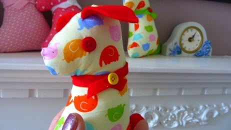 A cute design of a puppy dog cut from Makower 100% cotton fabric which has a lemon background and multi coloured little elephants and machine stitched for strength and filled with 100% polyester. The ears, collar and tail cut from red felt and hand