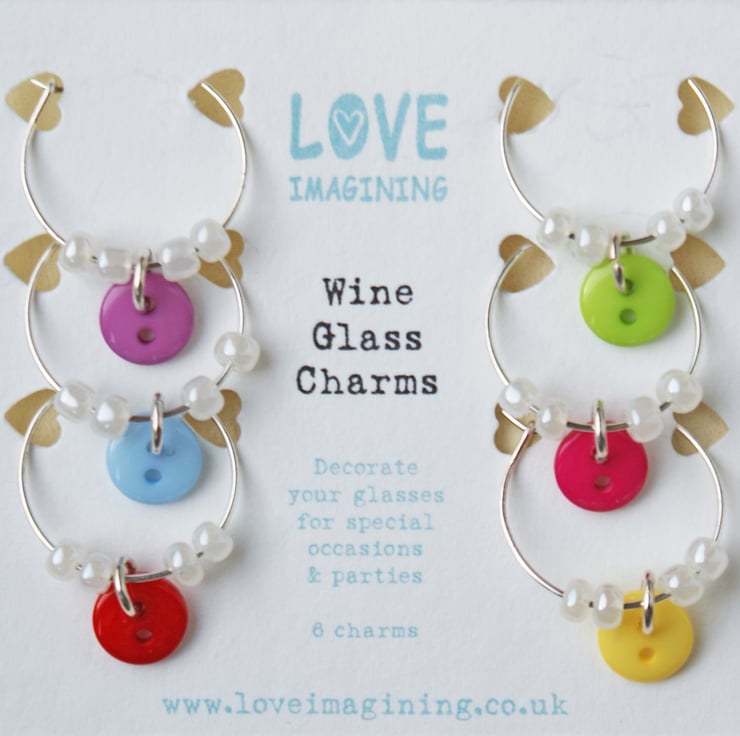 A set of six wine glass charms, perfect to attach to wine glasses during a party or barbecue. The charms make a pretty finishing touch to your party decor, and help your guests to remember which glass is theirs.