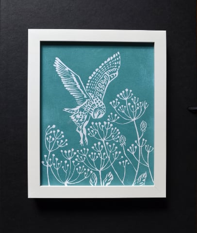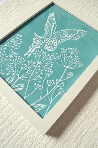A handcut linoprint based on my own drawing, then hand printed onto lightly textured paper (240g white) using water based ink. Each print is signed with my signature.