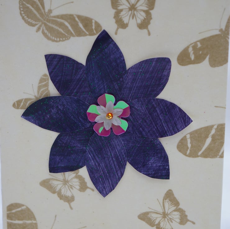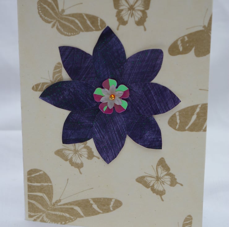 A handmade card featuring a large purple flower on an enchanting back ground of butterflies. The flower is hand painted in purple which I’ve added some green glitter into. Into the centre of the flower are sewn two pink flower sequins and a tiny orange bead. This is then mounted onto a background of flying butterflies printed onto cream colour paper.
