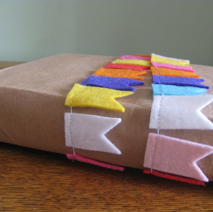 The bunting has a variety of uses including; to wrap around a gift instead of ribbon, to decorate cards or cakes, scrap booking or to simply hang up. Just snip the desired length and secure with double sided tape or tie using the lengths of cotton left at each end.