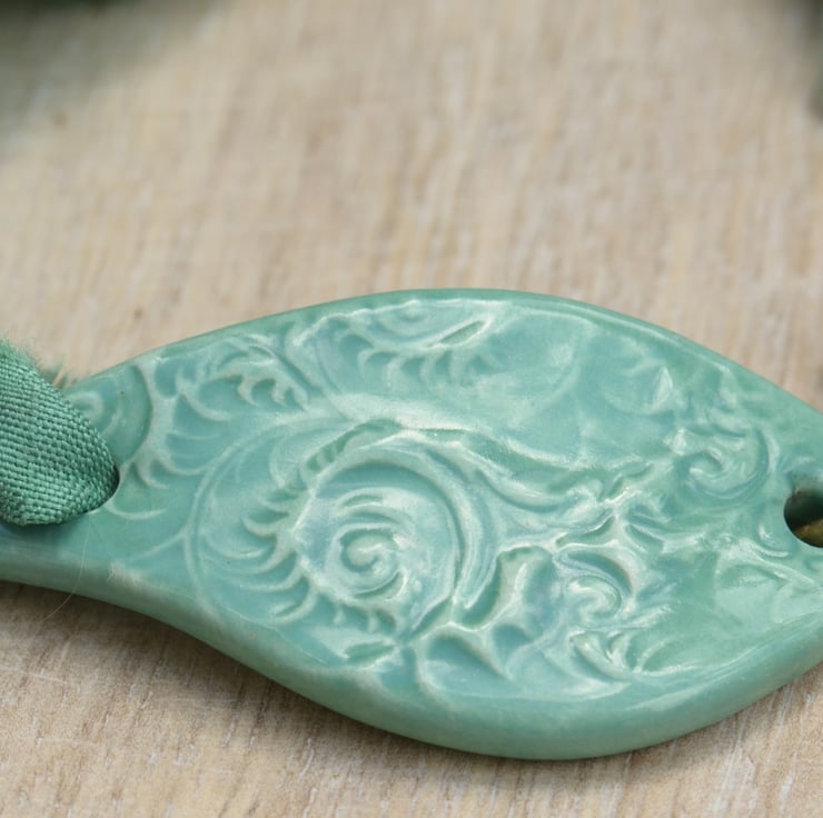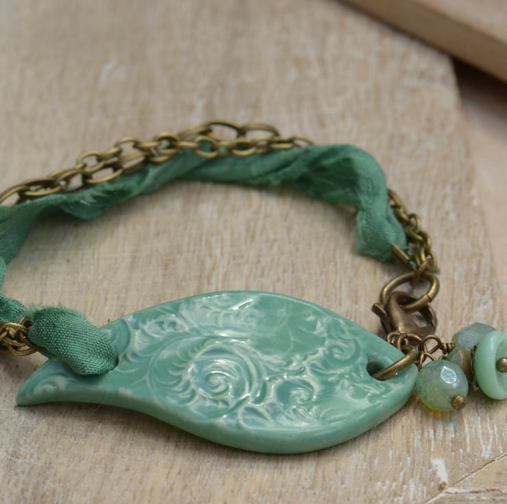 A lovely curved ceramic bracelet bar is the focal for this bracelet which I have teamed with a strand of lovely sea green sari silk ribbon and two strands of antique bronze chain and finished with a trigger clasp and a little bouquet of Czech minty glass beads.