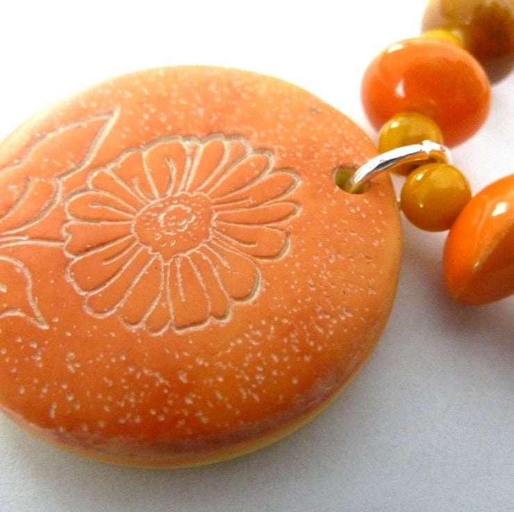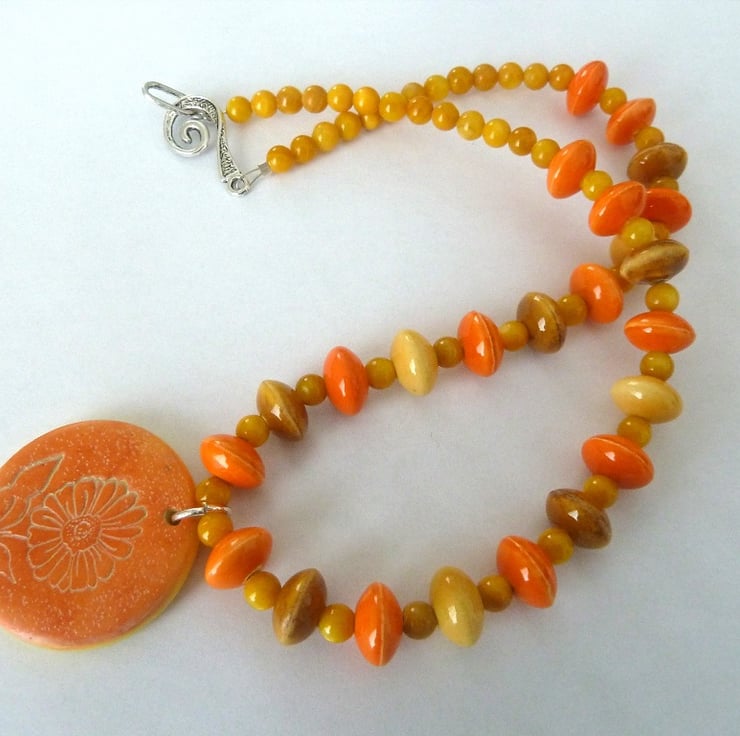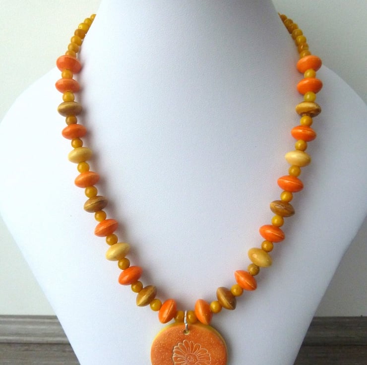 A necklace made using a handmade polymer clay pendant which is yellow and orange and has a image of a flower, the pendant is strung with orange, yellow and brown ceramic discs and yellow shell beads.