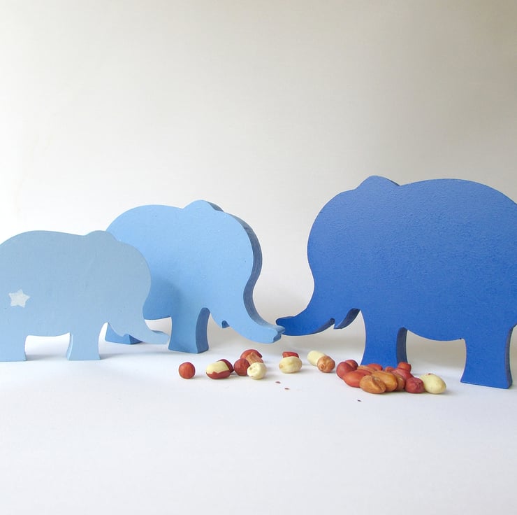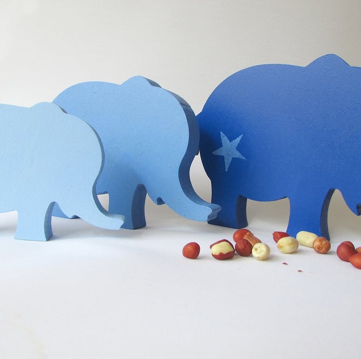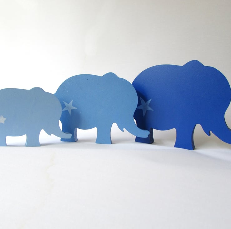 A set of 3 Elephants painted in varying shades of blue, each Ellie has a single painted star on it's side. The reverse is also painted blue.