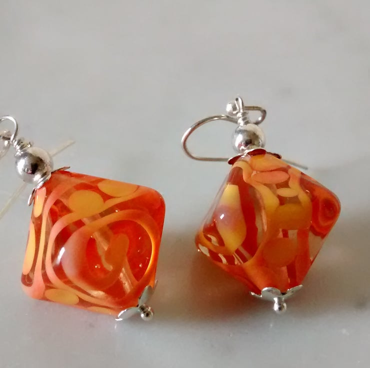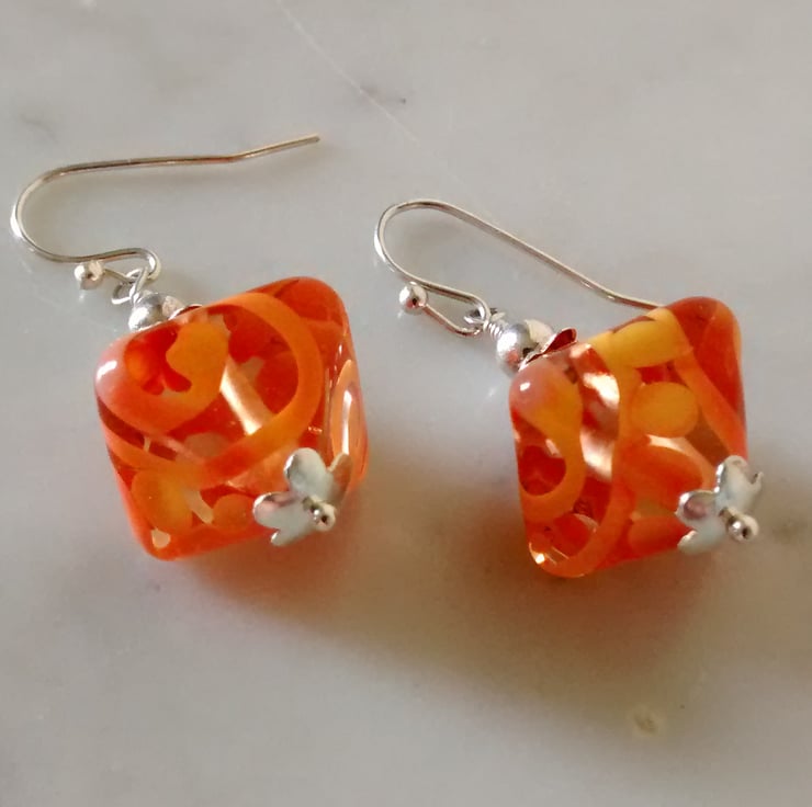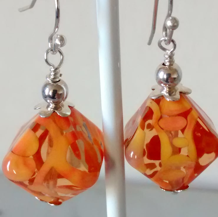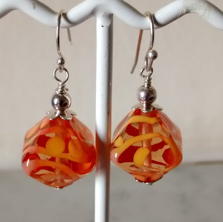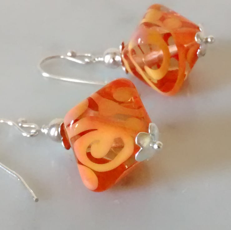 Handmade earrings consisting of lovely deep orange Lampwork beads and Sterling Silver bead caps.Hanging from Silver Plated Earwires