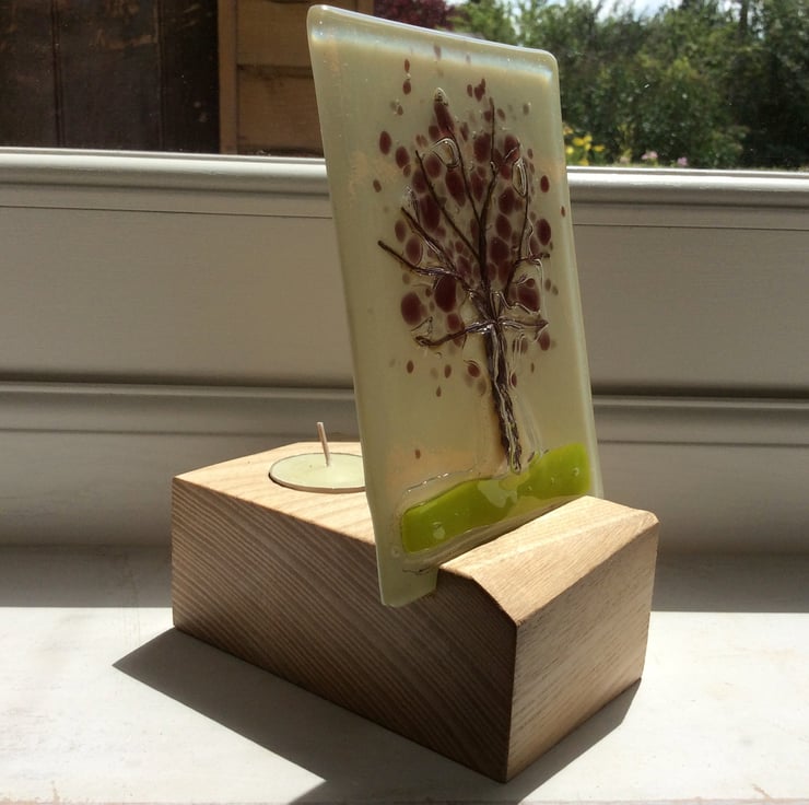 Fused cream glass panel with copper wire tree and purple blossom, mounted in a waxed wooden block with tea light holder.