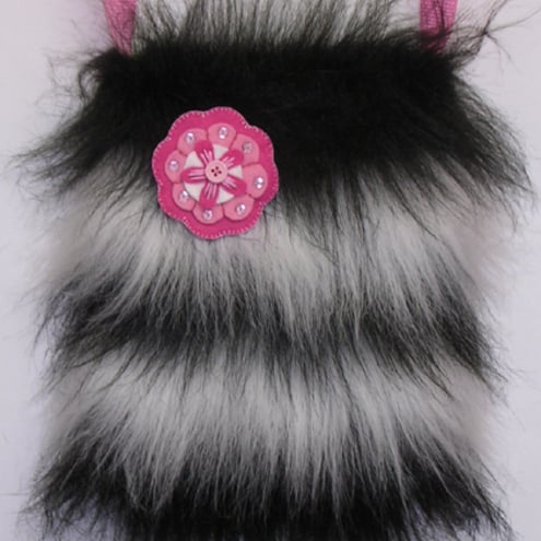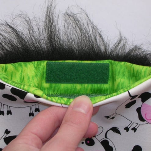The front panel is a 100% cotton fabric featuring pretty daisy-wearing cows. The back panel is fluffy stripes that I have made from black and white soft long fur fabric. Inside you will find a 100% cotton lining in a funky green grass design - just right for the cows to feast on!