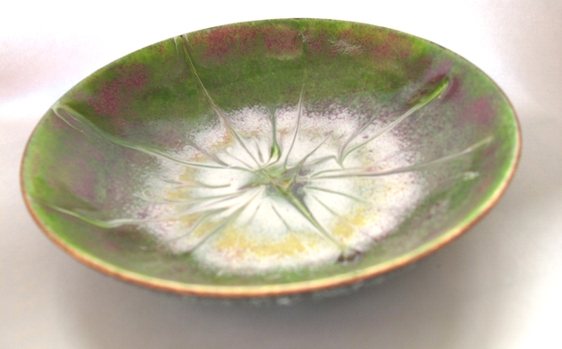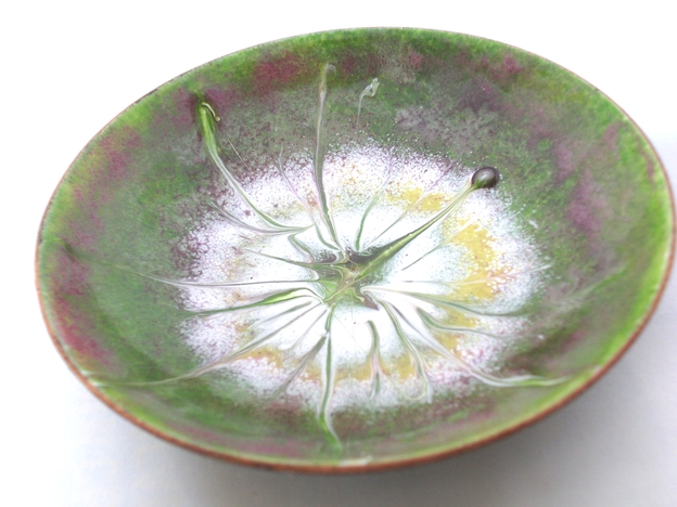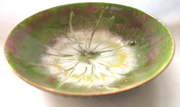 The pattern on this bowl is a random, unrepeatable, pattern I made by drawing a steel tipped tool through the enamel while the piece was red hot, in the kiln.