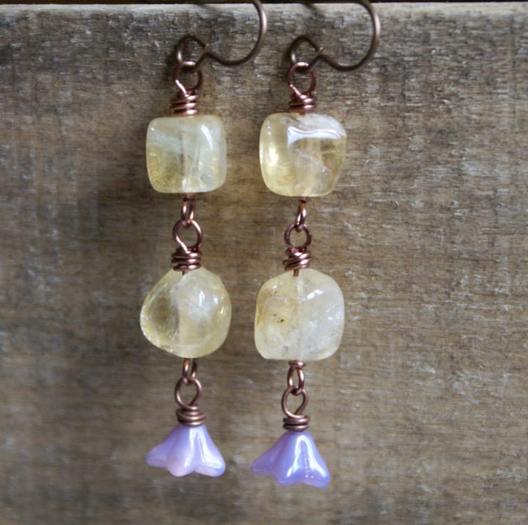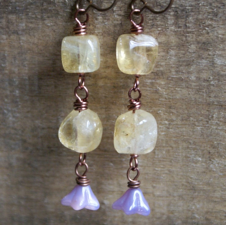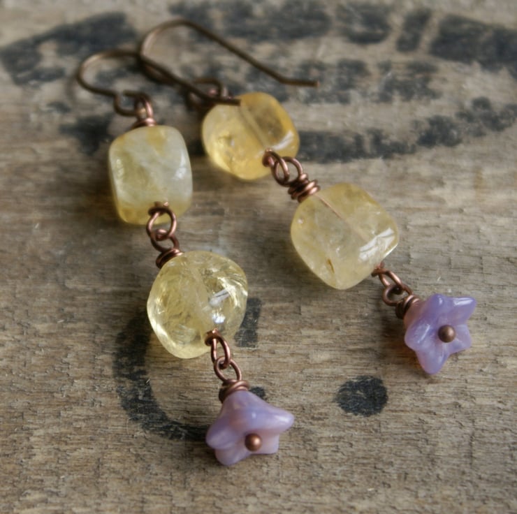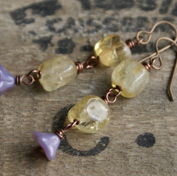 They have been made with beautiful Citrine gemstone chunks and sheer lilac Czech glass bell flowers, which have been wrapped together with antique copper wire.
