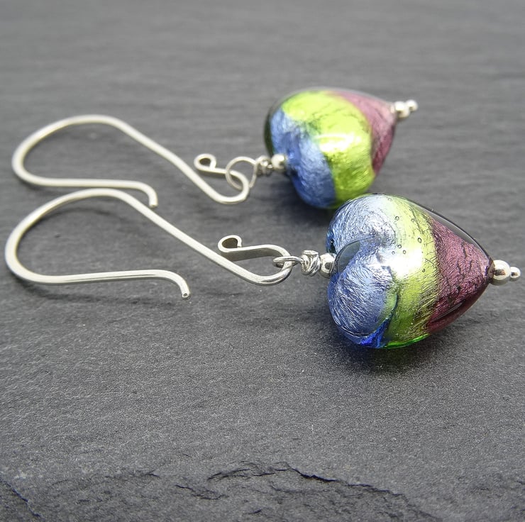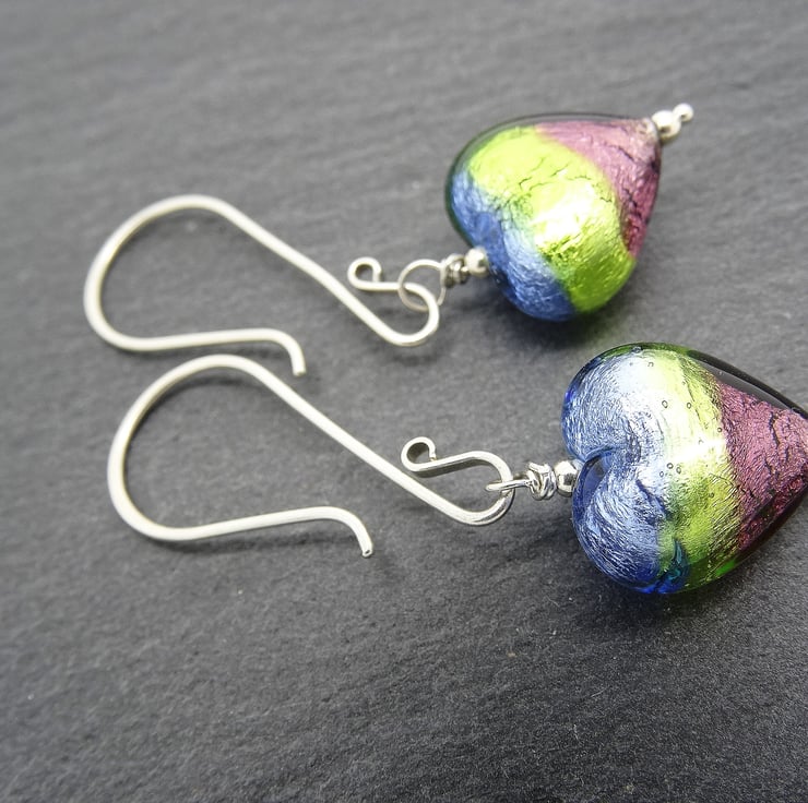 These earrings are scrumptious!!! They are made from 14mm puffy murano glass hearts, the pattern is Verde Sapphire and they shimmer beautifully. They hang from sterling silver handmade earwires which are swan shaped. The earrings measure just under 5cm from top of earwire. All of the murano glass I use is genuine, made on the island of Murano in Venice. As all of the items in my shop are individual pieces made by myself, these are the earrings you will receive. They will arrive gift wrapped in tissue paper and a organza bag.