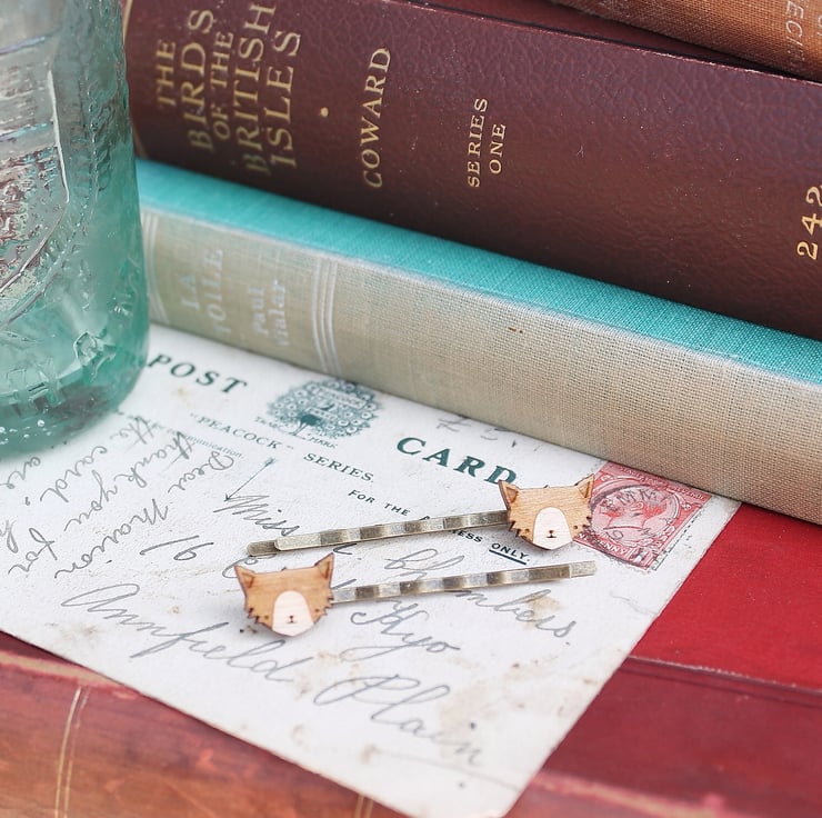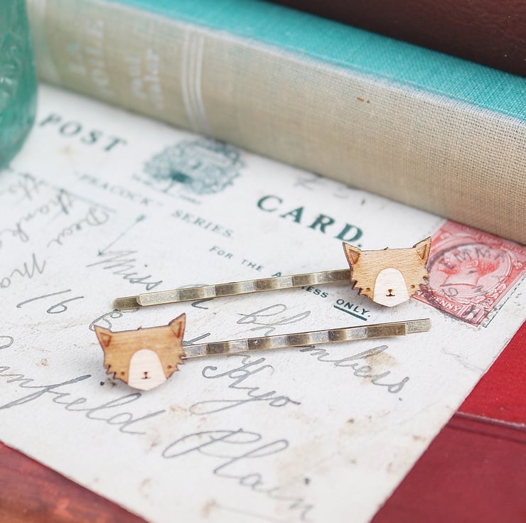 This pair of cat hair grips feature two laser cut cats glued securely to antique gold plated hair grips. The cats are laser cut from 3mm birch plywood and have been coated in wood oil to protect the wood and give it a lovely finish.