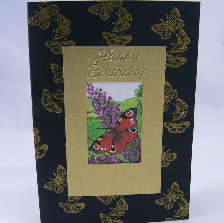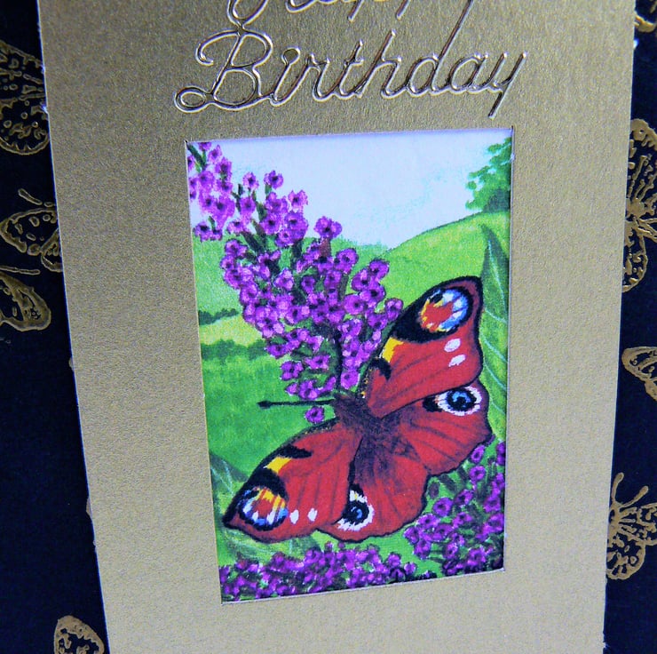 This card features a print of one of my original watercolour paintings of a peacock butterfly on a Buddleia plant. The card has a black background with gold embossed butterflies on and inside has a scented insert with the sentiments 'Best wishes' on, it comes with envelope and cellophane bag.