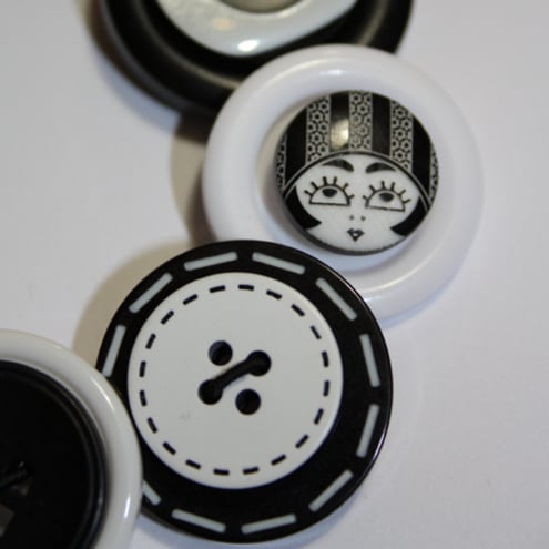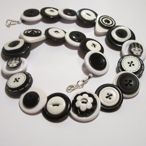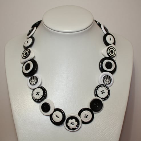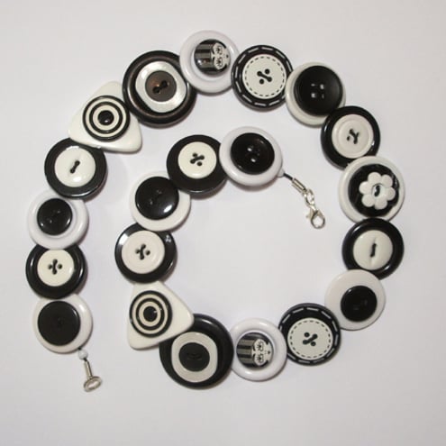 This distinctive button necklace is rich with an assortment of black and white coloured buttons.