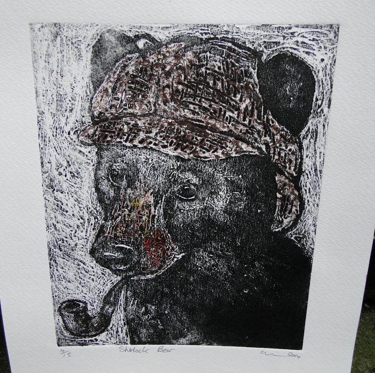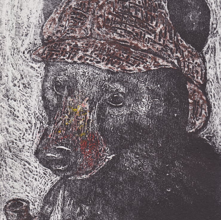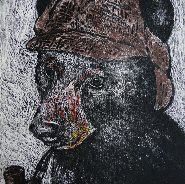 Hand printed on 300gm acid free watercolour paper in black, brown, red, yellow oil based ink.