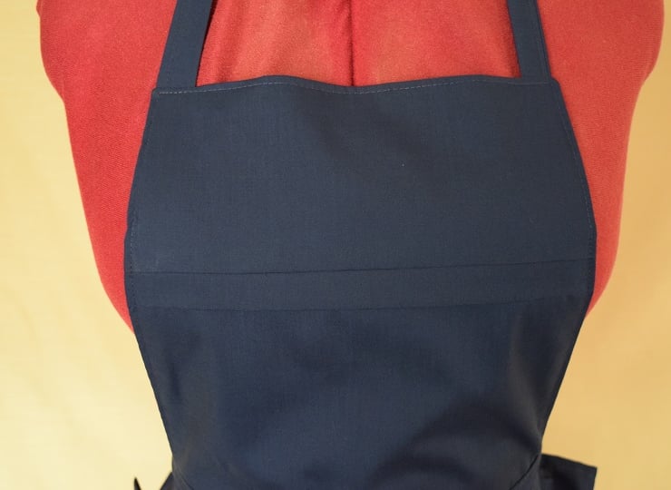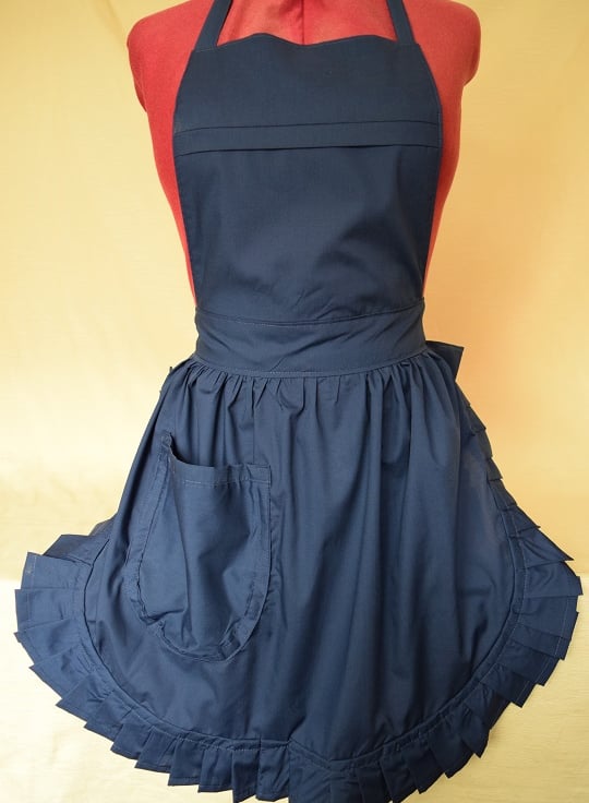 Here we have a lovely polycotton navy retro style apron, handmade in house to our own design. (see photos). Adjustable neck and waist ties so will fit up to a size 22.