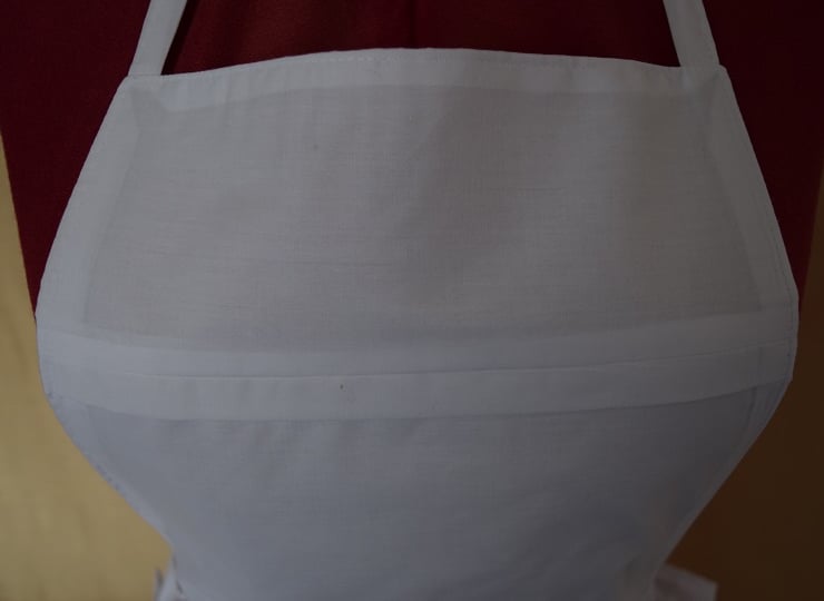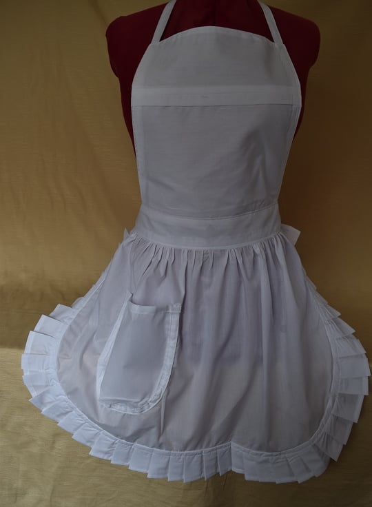 Here we have a lovely polycotton white retro style apron, handmade in house to our own design. (see photos). Adjustable neck and waist ties so will fit up to a size 22.