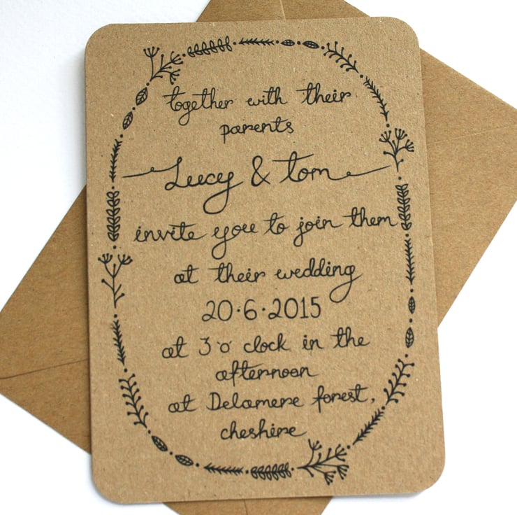 Simple, pretty and rustic wedding invitation with pretty personalised hand lettering and a woodland botanical illustrated frame.