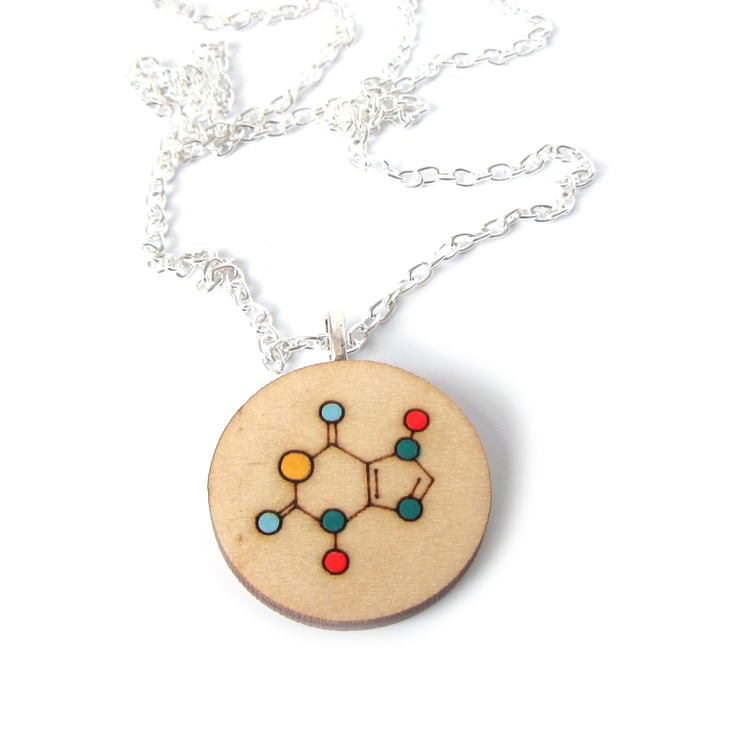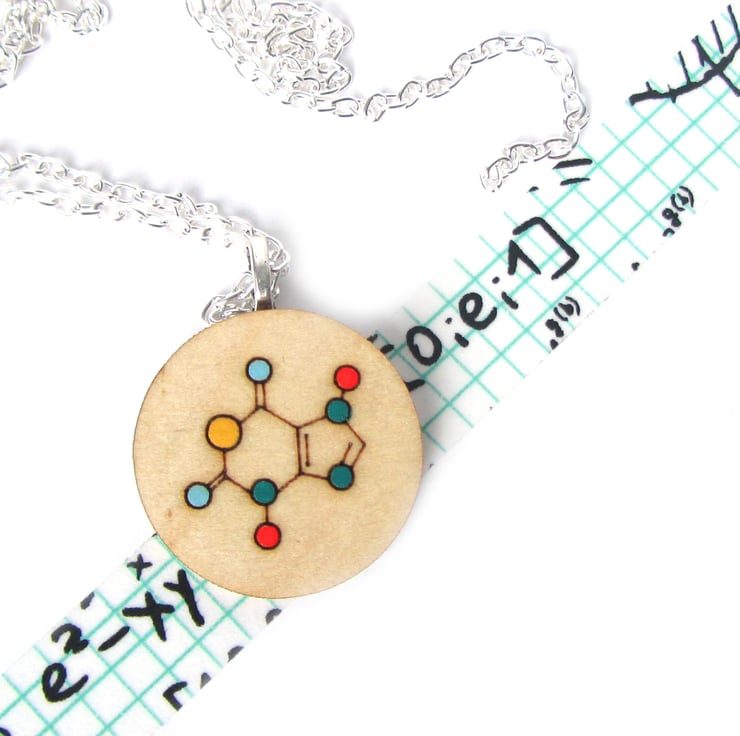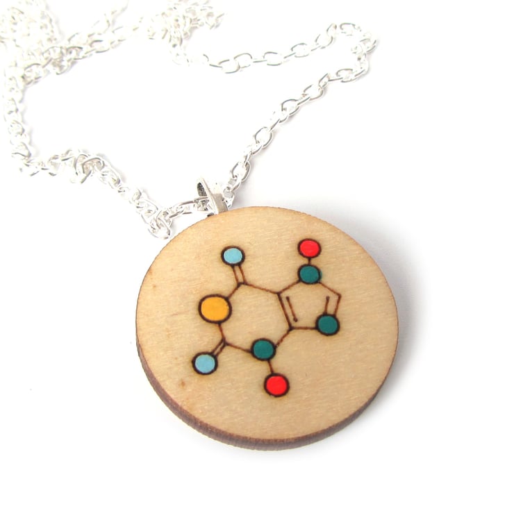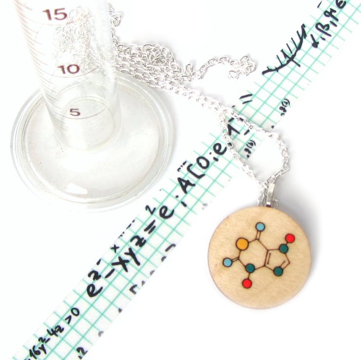 Wooden circular disc made from plywood, with laser cut detail of the chemical formula for chocolate. Painted in fluorescent red, pale blue, mustard and green. Sealed with varnish and a protective enamel layer.