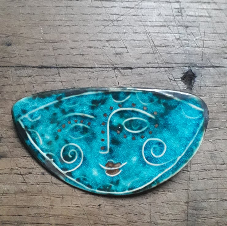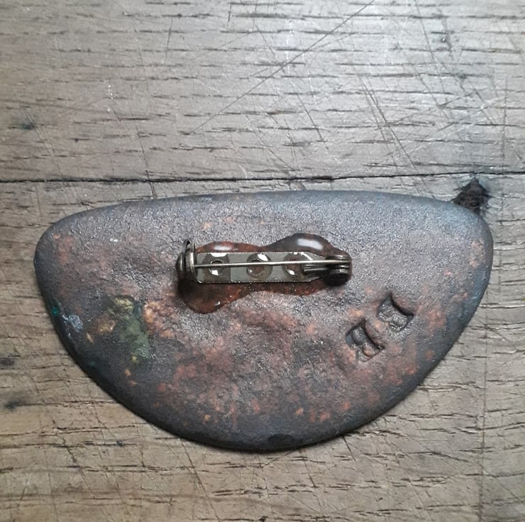 Pressed porcelain brooch,copper and turquoise glaze with hand painted gold lustre.Each piece is unique but I endeavour to repeat them as accurately as possible