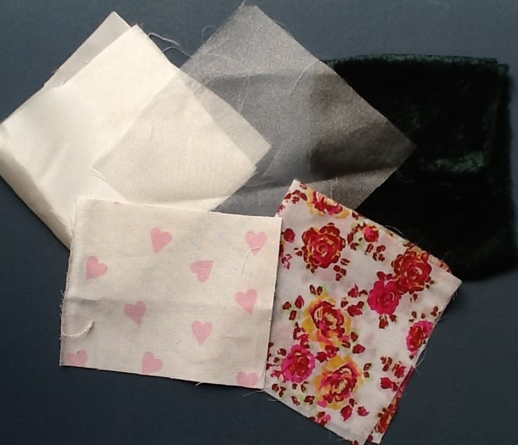 5 x various fabric pieces (sizes, pattern and type will vary but all will be at least 4"x4" and mostly much larger)