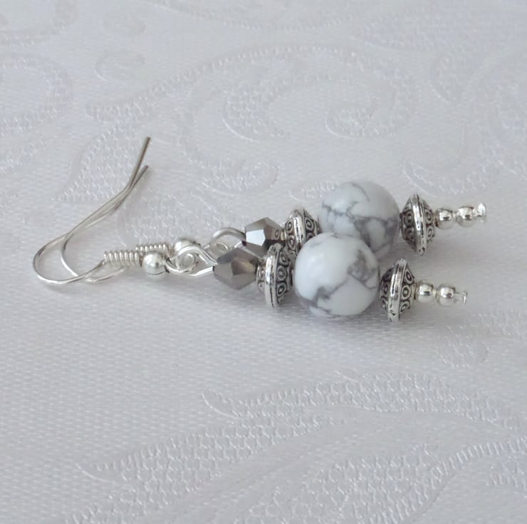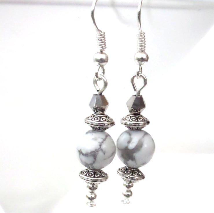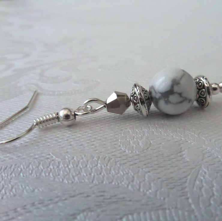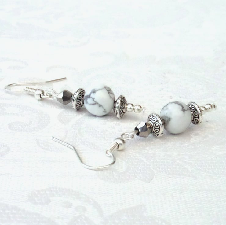 A unique pair of earrings, made with 8 mm howlite semi-precious gemstones and silver crystal.