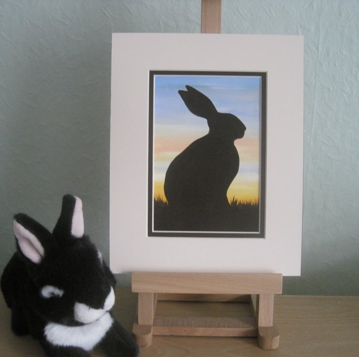 The subject is a sitting bunny, painted in dark brown, silhouetted against a sky in shades of blue, white, lemon and peach.