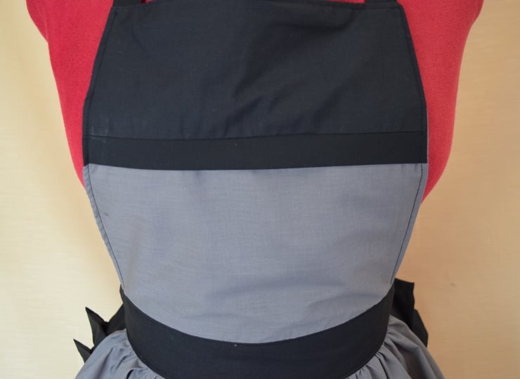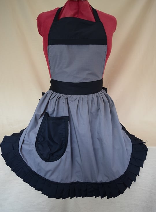 Here we have a lovely polycotton grey with black trim retro style apron, handmade in house to our own design. (see photos). Adjustable neck and waist ties so will fit up to a size 22.