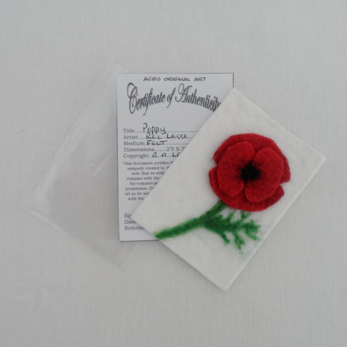 This ACEO is a 3D picture of a poppy made from hand felted merino wool and then needle felted onto a wool blend (30% wool, 70% acrylic) felt base and mounted on 300gsm card, signed and dated on the reverse. It also comes with a certificate of authenticity and plastic sleeve to protect it.