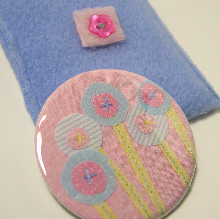 The adorable flowers design is hand cut and sewn onto a textile background ( not printed) and covered with a protective plastic surface before being pressed onto the mirror.