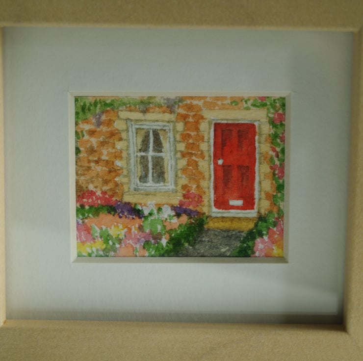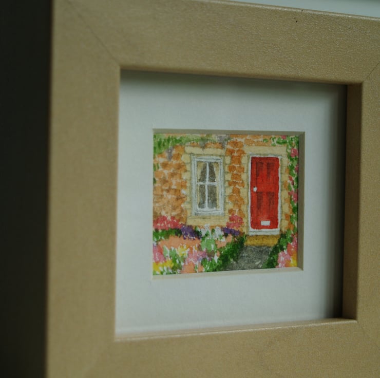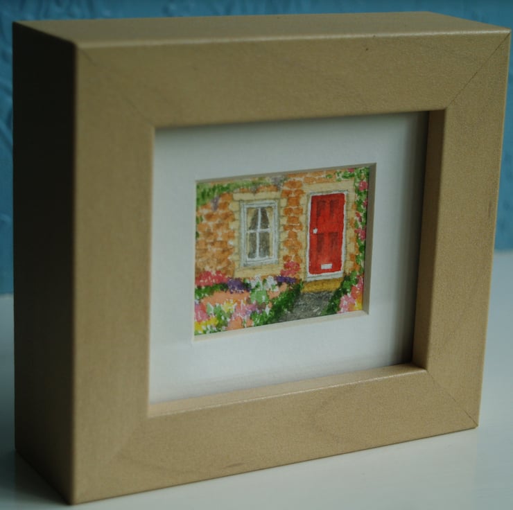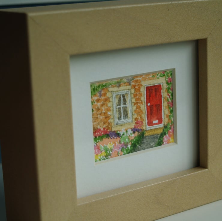 A framed miniature watercolour of a little cottage garden. The overall dimensions of the frame are 10 cm x 11 cm and 3.5 cm deep. The frame is self-standing, as in the photos, but could be wall mounted if you wanted.