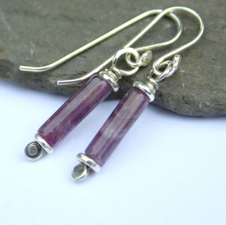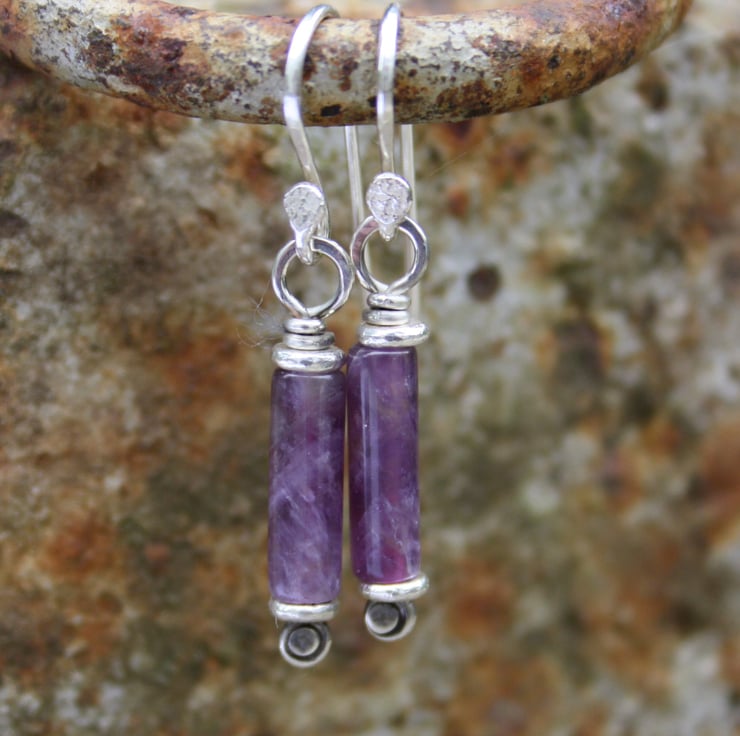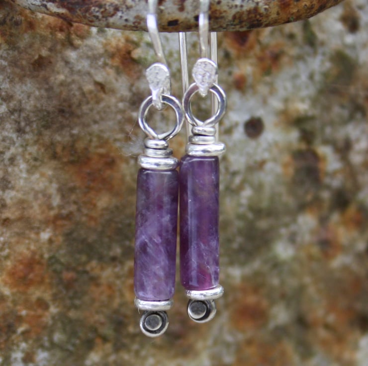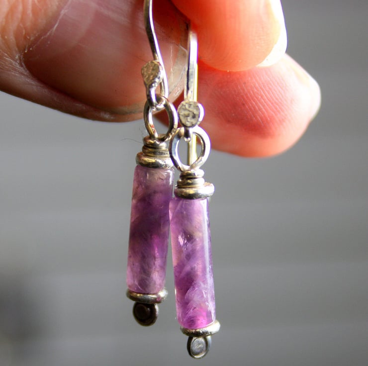Forged sterling silver pins have been threaded through 5mm silver washer beads and pretty amethyst tubes.