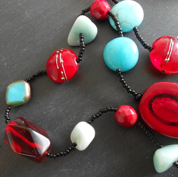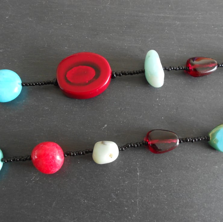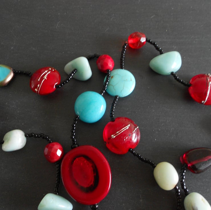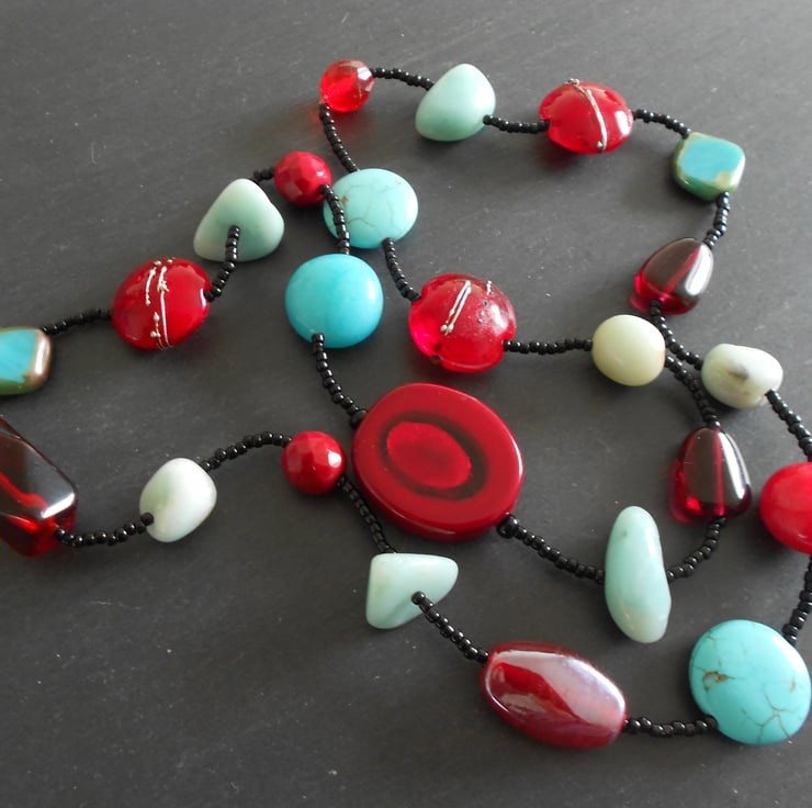 This is a gorgeous necklace made with a selection of gemstones including Amazonite, Jade and Turquoise, and also handmade lampwork glass beads and czech glass. It is a long necklace threaded on Beadalon Supplemax which is a strong jewellery thread, it just slips over your head, so easy to wear. The length is 71cm (28"). As all of the items in my shop are individual pieces made by myself, this is the necklace you will receive. It will arrive gift wrapped in tissue paper and a organza bag.